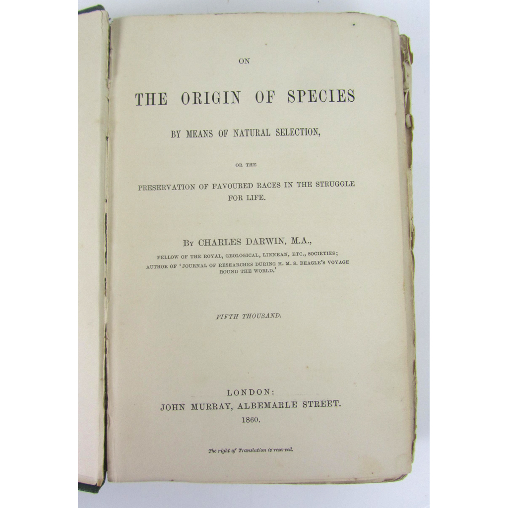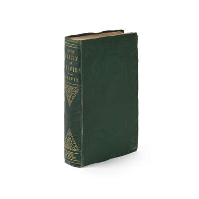 On the Origin of Species. London: John Murray, 1860. Second edition, "fifth thousand" (second issue), 8vo, folding diagram, 32pp. adverts at rear, original green blind-stamped cloth with gilt tooling to spine, bookplate of James Whittle, previous ownership inscription to free-endpaper, quotation written on half-title, hinges splitting, repair to pp.365-6, a little foxing throughout, some pages a little loose, a little bumping to covers and rubbing to joints