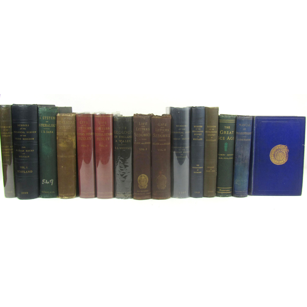 The Geology of England and Wales. 1876, folding map, plates, original cloth; Geikie, A. The Geology of Central and W. Fife and Kinross. 1900, 3 copies; Geikie, J. The Great Ice Age. 1894; Bailey, E.B. & others Tertiary and Post-Tertiary Geology of Mull, Loch Aline and Oban, 1924; The Silurian Rocks of Britain. 1899, vol. 1 only; The Geological Structure of the N.W. Highlands of Scotland. 1907, map supplied in facsimile; The Geology of the Neighbourhood of Edinburgh. 1910; Geology of E. Fife. 1902; Nicholson, H.A. A Manual of Palaeontology. 1879. 2 volumes, a few library stamps, Lewis, H.C. Papers and Notes on the Glacial Geology of Great Britain. 1894; Huxley, L. Life and Letters of Thomas Henry Huxley. 1900. 2 volumes; Clark, J.W. Life and Letters of the Rev. Adam Sedgwick. 1890, 2 volumes; some volumes rubbed; sold not subject to return