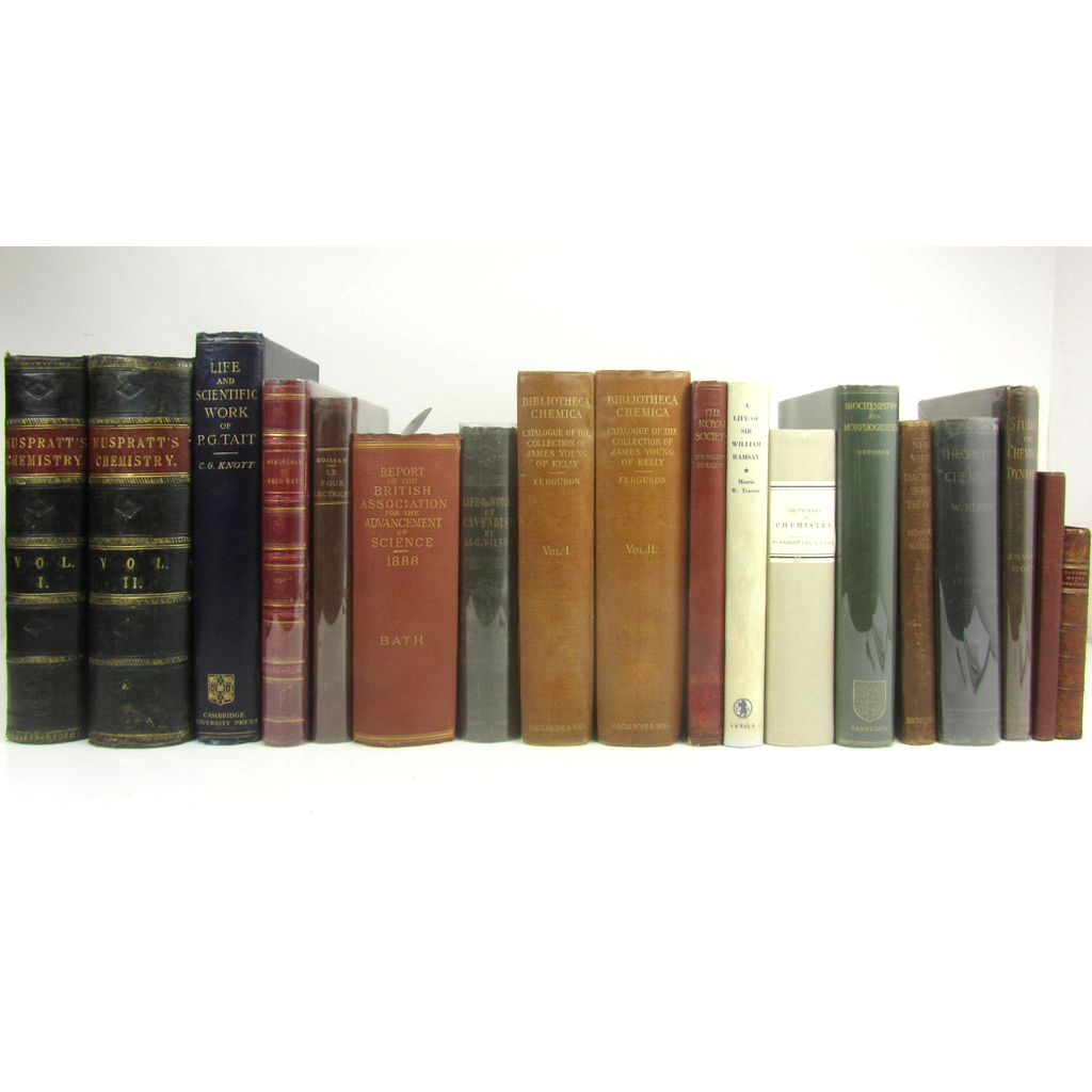 Memorials of the Lineage... of James Watt. 1856. 4to., plates, red morocco gilt, joints slightly rubbed; Ferguson, John Bibliotheca Chemica. 1906. 2 volumes, limited to 250 copies, original buckram, uncut; Moissan, H. Le Four Electrique. Paris, 1897. First edition, 8vo, early buckram, repaired head and foot; Ure, A. A Dictionary of Chemistry. 1824, 8vo, modern boards; Muspratt, S. Chemistry. [1854-60], First edition, 2 volumes, 4to., plates, half calf, slightly rubbed; van 'T Hoff, J.H. Studies in Chemical Dynamics. 1896, original cloth, few library stamps; Knott, C.G. Life and Scientific Work of Peter Guthrie Tait. 1911. 4to., prize label of Charles Kemball (B.1923); Wilson, G. The Life of the Hon. Henry Cavendish. 1851. 8vo, frontispiece, original cloth; Needham, J. Biochemistry and Morphogenesis. 1942, original cloth; Travers, M.W. A Life of Sir William Ramsay. 1956, dust-jacket; British Association for the Advancement of Science. Report of the Fifty-Eighth Meeting. [including Charles Babbage paper, p.616] 1889. 3 copies, original cloth, one rubbed, one with small tears to spine; Brewster, David Letters on Natural Magic. 1824. 12mo, contemporary half calf; Klein, Felix Vorlesungen über die Theorie der Elliptischen Modulfunctionen. Leipzig, 1890. 2 volumes, buckram; Freicke, R. and F. Klein. Vorlesungen über die Theorie der Automorphen Functionen. Leipzig, 1897. 2 volumes, buckram; sold not subject to return (quantity)