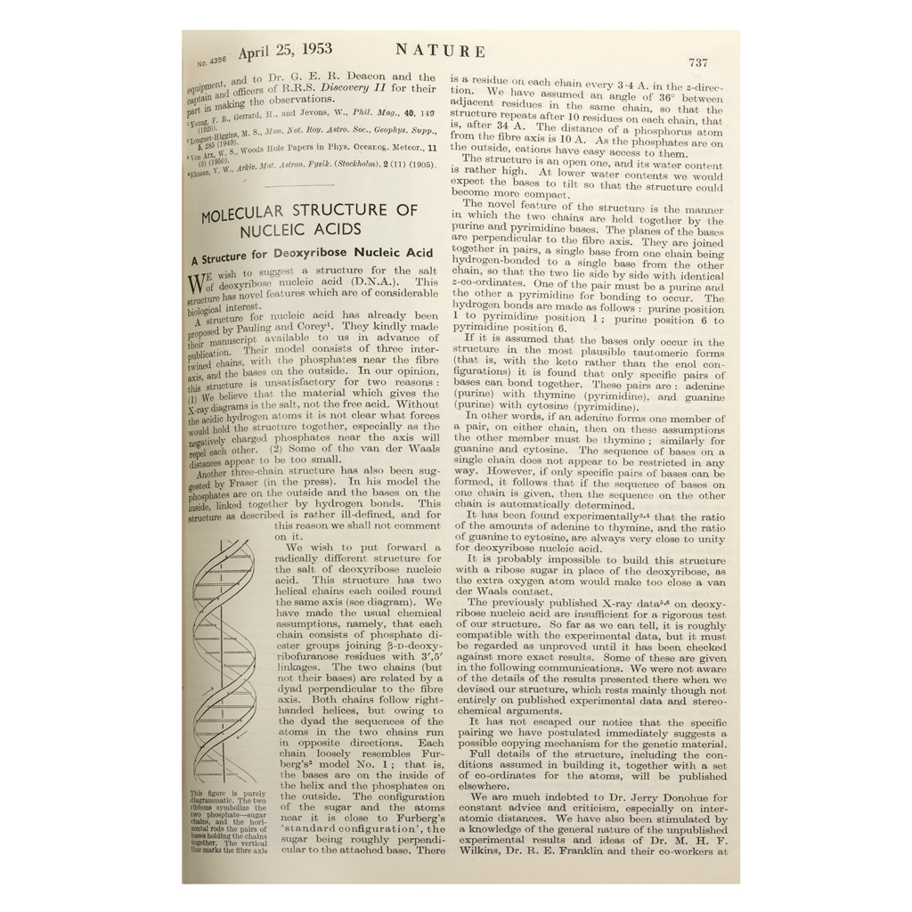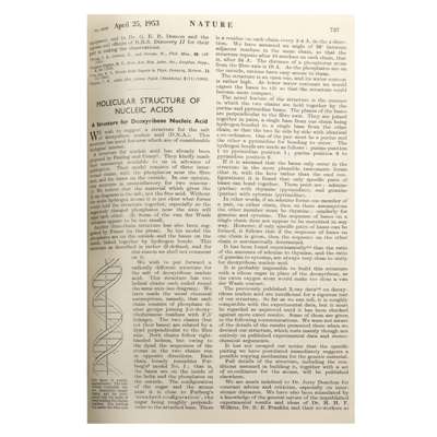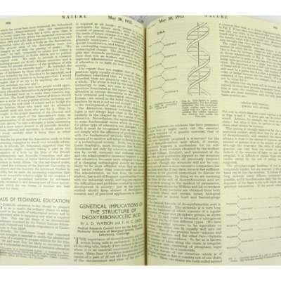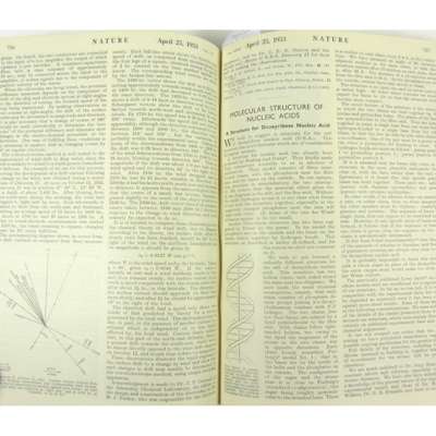 Molecular Structure of Nucleic Acids. A Structure for Deoxyribose Nucleic Acid. and Genetic Implications of the Structure of Deoxyribonucleic Acid, in : Nature, Vol 171, pp 737-738 & 964-967, original buckram; and vol. 172