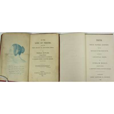 Teeth, their Natural History. London, 1862, 12mo, original maroon cloth, discoloured; Howard, Thomas On the Loss of Teeth. London, 1857, blue frontispiece with moveable flap, original red cloth, worn, hinges weak; Duval, J.R. Le Dentise de la Jeunesse. Paris, 1817. 8vo, original wrappers, a few leaves slightly dampstained; Tomes, J. A System of Dental Surgery. 1859, illus., worn, one cover detached; Smith, J. Hand-book of Dental Anatomy and Surgery. 1864, inscription to title; another edition. 1871; Meredith, L.P. The Teeth and how to save them. 1872; Sewell, H. The Student's Guide to Dental Anatomy and Surgery. 1876, illus., original cloth; Stewart, J. The Mouth. Glasgow, [n.d.]; Clifford, I.E. Crown, Bar and Bridge-Work., 1885; Bowen, W.F. Submucous Injection in Dental Practice. 1910, original cloth; Underwood, A.S. Notes on Anaesthetics in Dental Surgery, 1893; Colyer, J.F. Extraction of the Teeth. 1896; and 11 others, later or more general (24)