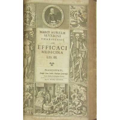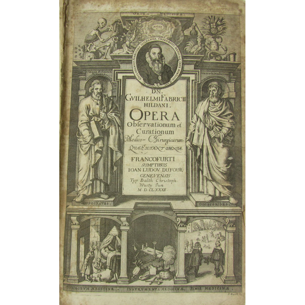 Opera quae extant omnia. Frankfurt-am-Main: J.L. Dufour, 1682. Folio, 2 parts in one volume; both parts with additional engraved title, both parts with imprint slips pasted over original imprints, numerous woodcuts in text, near contemporary calf, stamp on first printed title of University of Durham College of Medicine and Newcastle Medical & Surgical Society, neatly rebacked, corners repaired, occasional browning and spotting