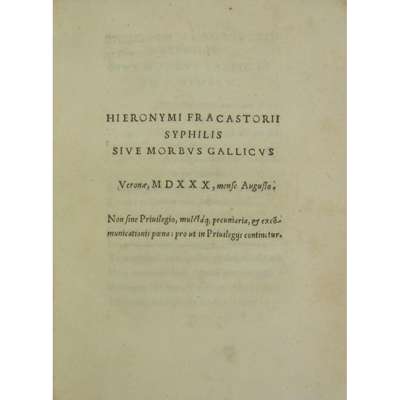 Syphilis sive Morbus Gallicus. Verona [Niccolini da Sabio], 1530. First edition, 4to., italics, 36 printed leaves, 2 (of 4) blank leaves at end, modern vellum, first gathering slightly spotted, dampstain to upper margin of d7-d8