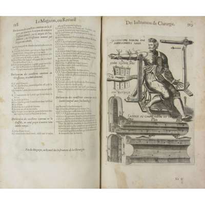 Les Oeuvres de Chirurgie. Rouen: J. Viret, F. Vaultier, C. Malassis, J. Besongne, 1649. Folio, [50], [1 blank leaf], 863, [32], title printed in red and black, full-page engravings, woodcuts in text, early 19th century half calf, title soiled, 15 preliminary leaves including title repaired in margin and somewhat soiled, some spotting, neatly rebacked, hinges repaired