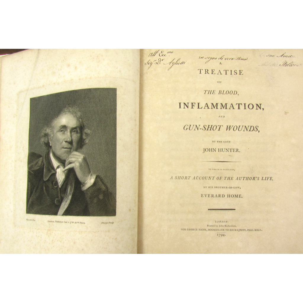 A Treatise on the Blood, Inflammation and Gun-Shot Wounds. London: G. Nicol, 1794. First edition, 4to., engraved portrait, and 9 plates (1-8 & 1 unnumbered at p.161), inscription at head of title, nineteenth century half calf, occasional spotting, rubbed, upper joint split