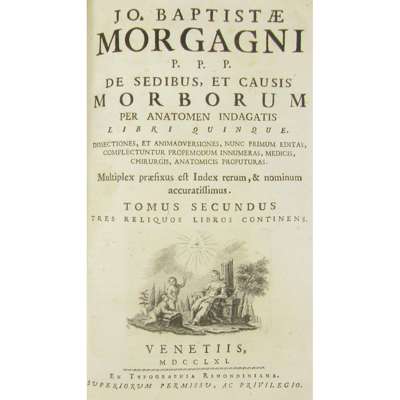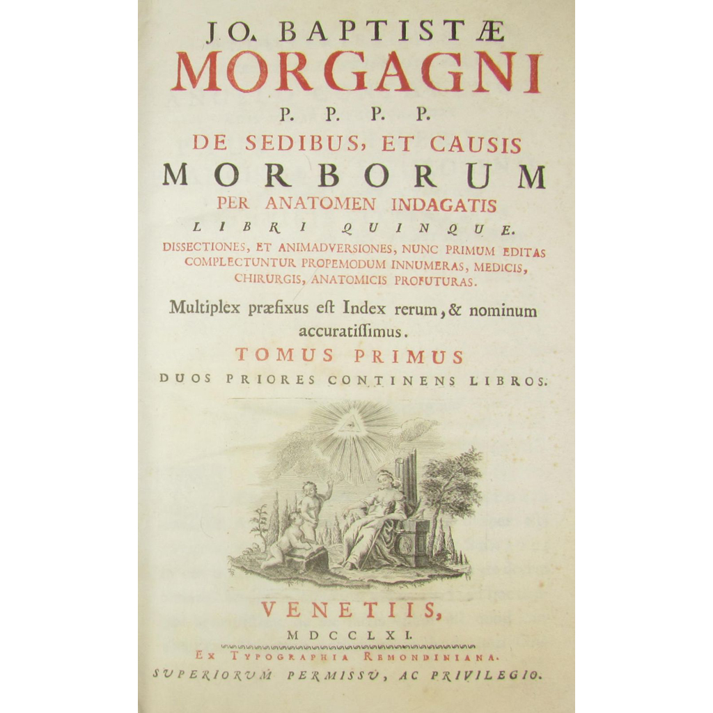 De Sedibus, et Causis Morborum per Anatomen Indagatis. Venice: Typographia Remondiniana, 1761. First edition, 2 volumes in one, folio, titles printed in red and black, half-title to volume 1, contemporary half calf, lacks portrait, slightly rubbed and scuffed