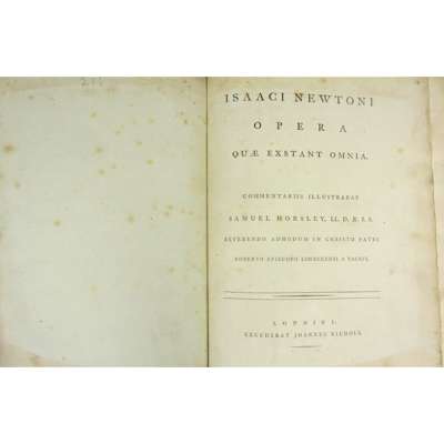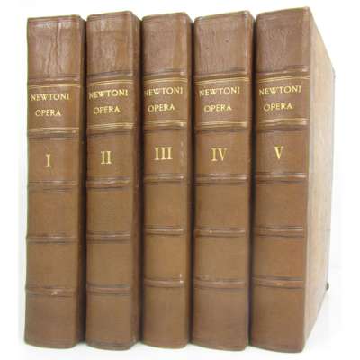 Opera quae exstant omnia. London: J. Nichols, 1779-85. 5 volumes, 4to., edited by Bishop Horsley, errata leaves, 3 (of 31) engraved plates, 2 folding engraved tables at p.378 vol.1, diagrams in text, contemporary calf, also lacks the portrait, rebacked, several corners repaired, slightly spotted, some corners rubbed
