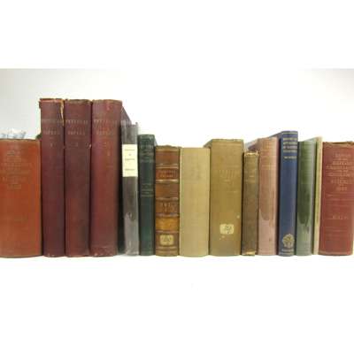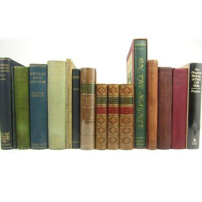 Conduction of Electricity through Gases. 1903. First edition, original cloth; [Pamphlets and Extracts] 108 pamphlets and extracts in 3 volumes, including Thomson, W. & P.G. Tait Sketch of Elementary Dynamics. 1864, 8vo, 2 volumes half calf, one lacking spine, 3rd volume original cloth; Tyndall, J. Six Lectures on Light. 1873, 8vo, original cloth, worn; Williamson, G. Memorials... of James Watt. 1856. 4to, plates, contemporary boards, uncut, new paper label; Kahlbaum, G.W.A. The Letters of Faraday and Schoenbein 1836-62. 1899. 8vo, portraits, original cloth; Soddy, F. The Interpretation of the Atom. 1932. First edition, 8vo, original cloth; McLachlan, N.W. Theory and Application of Mathieu Functions. 1947. First edition, presentation copy signed by the author, original cloth; Bohr, A. & B.R> Mottleson. Collective and individual-particle aspects of Nuclear Structure. Copenhagen, 1953, 8vo, original wrappers, slightly rubbed; Physical Papers, so titled on spine Collection of extracts from the Philosophical Transactions of the Royal Society, by J.J. Thomson, H.L. Calendar, E.H. Griffiths, J.W. Captstick & others, bound in 3 volumes, 4to, plates, cloth, slight wear; British Association for the Advancement of Science. Report of the Fifty-Eighth Meeting. [including Charles Babbage paper, p.616] 1889. 2 copies, original cloth; Whewell, W. History of the Inductive Sciences. 1857. 3 volumes, 8vo, calf gilt; and others; sold not subject to return