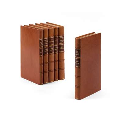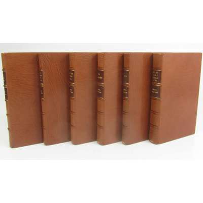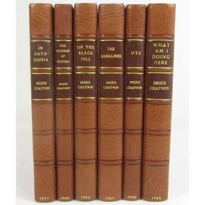 In Patagonia. London: Jonathan Cape, 1977; The Viceroy of Ouidah. London: Jonathan Cape, 1980; On the Black Hill. London: Jonathan Cape, 1982; The Songlines. London: Jonathan Cape, 1987; Utz. London: Jonathan Cape, 1988; What Am I Doing Here. London: Jonathan Cape, 1989. All first editions, 8vo., In Patagonia has 2 maps and 4 leaves of plates, bound by Bayntun-Riviere in modern full morocco, spines lettered in gilt on brown leather labels, Japanese paper endleaves, gilt edges, original endpapers bound in at the end (6)