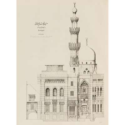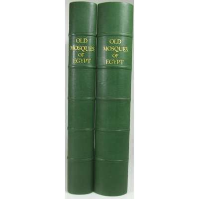Masajid Masr [Mosques of Egypt from 21 (641) to 1365 (1942)]. Jazira: Egyptian Official Press, 1948. 2 volumes, folio, Arabic text printed in red and black. Double-page chromolithographic title borders, 215 photographic plates from glass negatives and 30 coloured plates, some chromolithographed, illustrations, some full-page, 2 large folding lithographic maps and 44-page index in inner pocket, original green cloth, later morocco-backed slipcases, slightly affected by damp with minor undulation of leaves and occasional marginal waterstains (2)