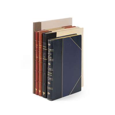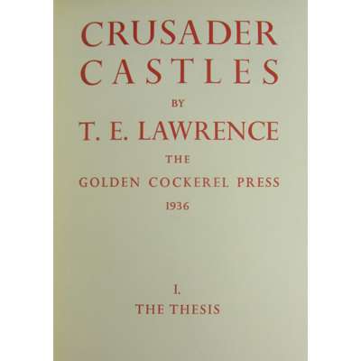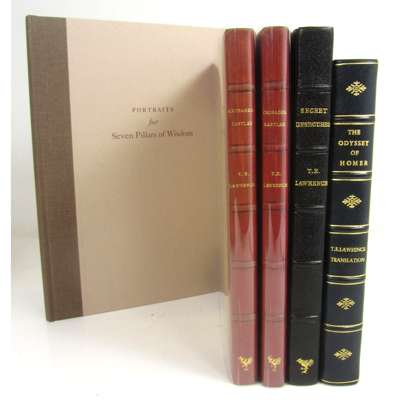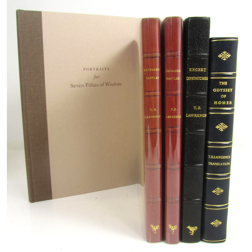 Crusader Castles. [London]: Golden Cockerel Press, 1936. First edition, 2 vols, 4to., no. 88 of 1000, 8 plates, 47 leaves of plates, 2 maps, illustrations throughout the text in vol. 2, 2 folding maps in a loose pocket, photographic frontispiece in vol. 2, bookplate of "Charles Owen Dennis" in each volume, original orange half morocco, spines lettered in gilt, cream cloth sides, top edges gilt, uncut at fore-edges and bottom, title-pages printed in red, light soiling to the cloth sides; [Idem] Secret Despatches from Arabia. [London]: Golden Cockerel Press, [1939]. First edition, 4to., no. 166 of 1000, photographic frontispiece of the author, original black quarter morocco, bound by Sangorski & Sutcliffe, spine lettered in gilt, cream buckram boards, top edge gilt, uncut at fore-edges and bottom, 2 small weak marks on front & back endpapers from sellotape; [Idem] The Odyssey of Homer. London: Oxford University Press, [1935]. First English edition, 8vo., original dark blue half morocco gilt, spine lettered and decorated in gilt, edges gilt, emblem on title-page slightly offset; Portraits for Seven Pillars of Wisdom. Fordingbridge: Castle Hill Press, 2008. First edition, no. 134 of 220, a collection of 42 coloured and monochrome plates (including the frontispiece), quarter cloth with paper sides