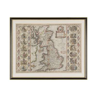Britain As It Was Devided in the tyme of the Englishe Saxons... London: John Sudbury & George Humble. [After 1611] Engraved and hand-coloured map of the British Isles with vignettes of Saxon figures, 520 x 390mm., mounted, double-glazed, text to reverse, some colour bleeding through onto verso, slight repair to centre-fold at base