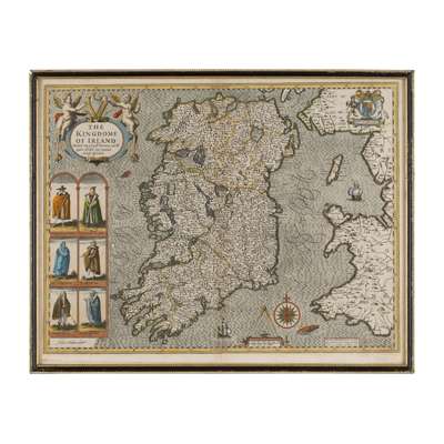 The Kingdome of Irland. London: John Sudbury & George Humble, 1610. Hand-coloured etching with 6 Irish characters and royal crest, 510 x 390mm., framed, text of 'Ireland Described, Book 4' on reverse, slight crease running down centre of map