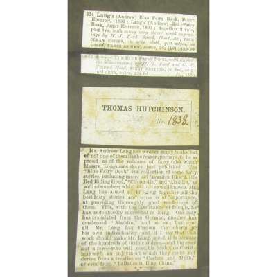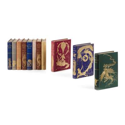 [Idem] The Blue Fairy Book, 1889. First edition, with an ALS from Laing to Thomas Hutchison laid-in, commenting, "This book is only meant for children...", 8 full-page illustrations, 16pp. publisher's catalogue dated August 1889; Lang, Andrew The Red Fairy Book, 1890. First edition; [Idem] The Green Fairy Book, 1892. First edition, slight rubbing to upper cover; [Idem] The Yellow Fairy Book, 1894. First edition, with upper cover of franked envelope in Lang's hand to frontispiece verso; [Idem] The Pink Fairy Book, 1897. First edition; [Idem] The Grey Fairy Book, 1900. First edition; [Idem] The Violet Fairy Book, 1901. First edition; [Idem] The Crimson Fairy Book, 1903. First edition; [Idem] The Brown Fairy Book, 1904. First edition; [AND] another copy; all London: Longmans, Green, and Co., 8vo in original cloth, many with the bookplate of Thomas Hutchison, booksellers' catalogue entries, notes on Lang and other small items of ephemera laid-down to endpapers and initial leaves, some with Hutchison's writing and catalogue numbers to endpapers; [Idem] The True Story Book. London: Longmans, Green, and Co., 1893. 8vo, original cloth (11)