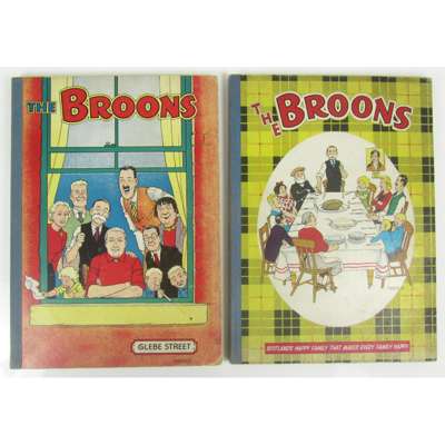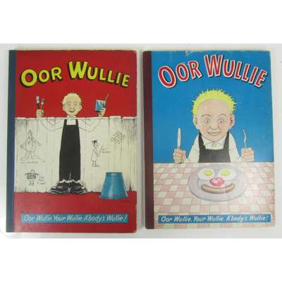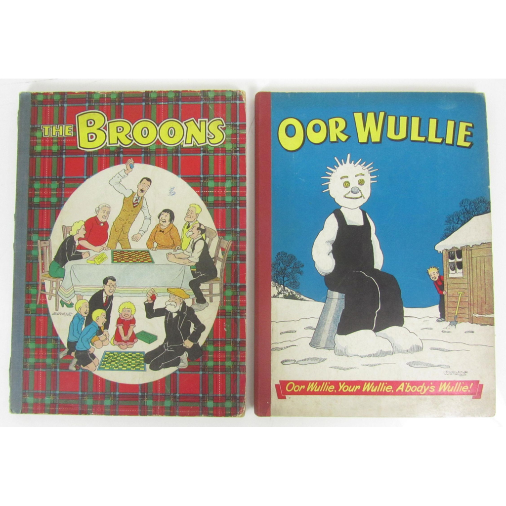 Oor Wullie. Glasgow, London, Dundee: D.C. Thomson & Co., Ltd. Annuals for the years 1957, 1959 & 1961; [Idem] The Broons. Glasgow, London, Dundee: D.C. Thomson & Co., Ltd. Annuals for the years 1956, 1958 & 1960; all in original card wrappers with cloth spines, a little internal browning, occasional light foxing, some general light wear and a little soiling to covers, annual for 1958 with gift inscription and address in blue biro to cover verso, some biro to upper cover and a little additional soiling throughout (6)