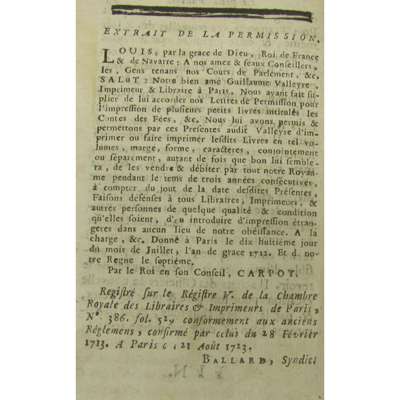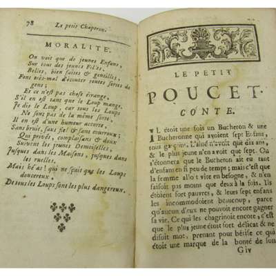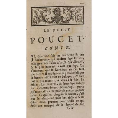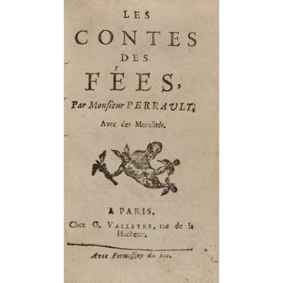 Les contes des fées, par Monsieur Perrault. Avec des moralités. Paris: chez G. Valleyre, 1723. Small 8vo, (c.150 x 90mm.), vi, [7]-95, [1]pp., woodcut ornament on title, woodcut ornamental headpieces, the 'moralitées' printed in italic later, later marbled boards, probably late 18th century, short tear without loss in 1 preliminary leaf, some dampstaining