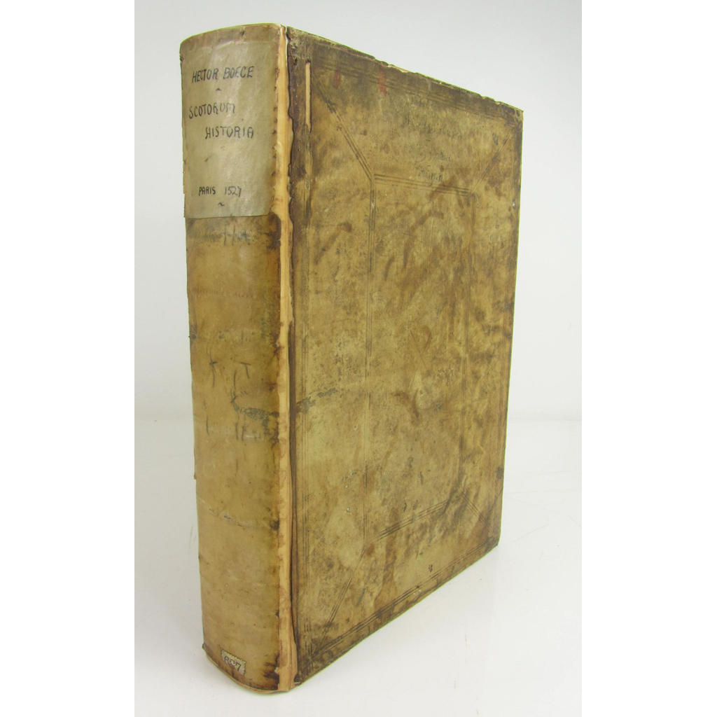 Scotorum Historiae a prima gentis origine...[N.p., n.d., but Paris:] Jodoci Badii Ascensii [1526?] Folio, signatures run: a8, e8, i8, o8, u10, AA-BB8, CC6, a-z8, A-Z8, contemporary vellum, rebacked, with later hand-written label to spine, repairs up to e8 and from 2Y-end, with a1 (title-page) extensively repaired with loss to title and verso, heavily annotated in an early hand, endpapers renewed, lacking clasps