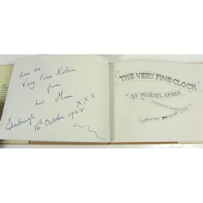 The Very Fine Clock. New York: Alfred A. Knopf, 1968. First edition, oblong 8vo, inscribed by Spark to an initial leaf: Love to Very Fine Robin from his Mum. xxx Edinburgh 16th October 1968, original orange cloth, dust-jacket not price clipped but with a few small tears
