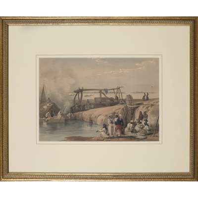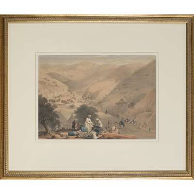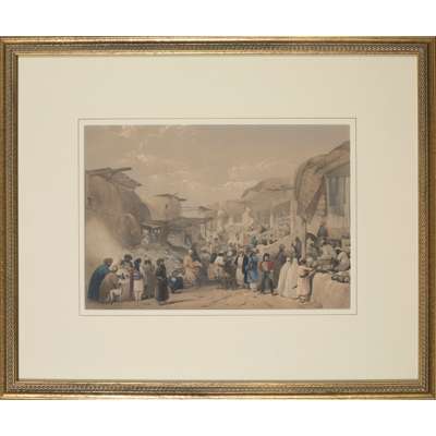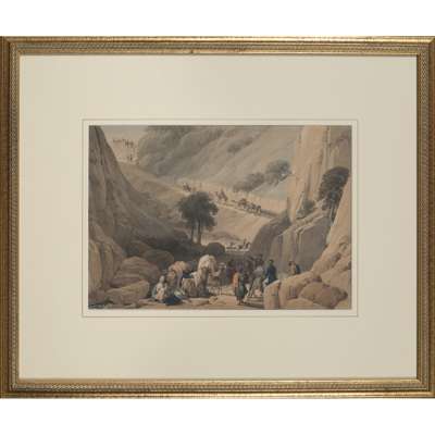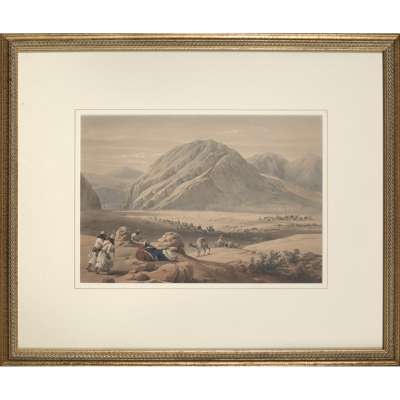 6 coloured lithographs from James Atkinson's Sketches in Afghaunistan [London: Henry Graves and Company, 1842], comprising: [2] Scene on the River Sutledge, [4] The Encampment at Dadur, [5] View of the Mountain Baba-Naunee, [14]The Third Descent through the Koojah Pass, [20] The Main Street in the Bazaar at Caubul, and [24] The Avenue at Baber's Tomb, each 25 x 35cm, framed and glazed, trimmed and laid-down to mounts [Abbey Travel 508] (6)