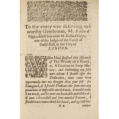 The Worth of a Peny, or, A Caution to Keep Money. London: S. Griffin for William Lee, 1664. Second edition, small 4to., modern crushed red quarter morocco, bookplate of Arnold Muirhead, a little light soiling, occasional very light dampstaining and a few early ink marks