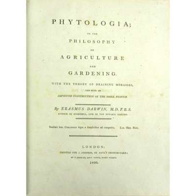 Phytologia, or the Philosophy of Agriculture and Gardening. London: J. Johnson, 1800. First edition, 4to, 12 engraved plates, 2 folding, contemporary red morocco gilt, spine gilt, black morocco lettering piece, a few light spots but a fine copy