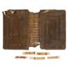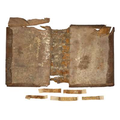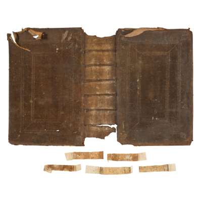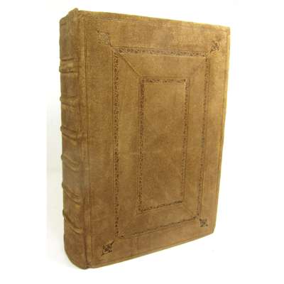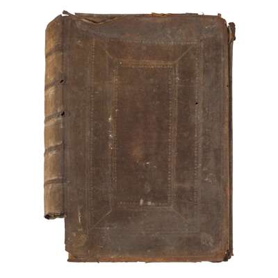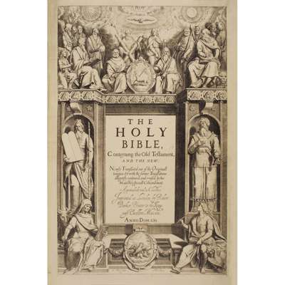 The Holy Bible Conteyning the Old Testament and the New. London: Robert Barker, 1611. Second folio impression with "she" reading in Ruth 3:15 and 'Judas' for 'Jesus' in Matthew 26:36 (this error corrected by hand), 20th century embossed brushed calf, the remains of the contemporary 17th century binding in the same style accompany the book, lacking 15 leaves comprising the 13 initial and 2 final leaves (all replaced in facsimile), lacking map, some small rust-holes on C6-D3 slightly affecting engraved headers, some dust-soiling throughout (particularly where thumbed to lower right corners) and light damp-staining to several leaves, large closed tear to upper corner of Ll5 (c.12cm), hole to Qq6 with loss to a few words, Kkk1 badly torn with lower quarter to a third of the leaf lacking, almost-closed tear to 2L1 (New Testament) with only slight loss to text, almost-closed tear to Z1 (New Testament) reaching across the page with slight loss to some letters, with a similar tear to Z3, upper corner of 2A2 torn with some loss to text, with a similar tear to 2A4 [Darlow & Moule 309, the Genealogies without the large cut of the Royal Arms]
