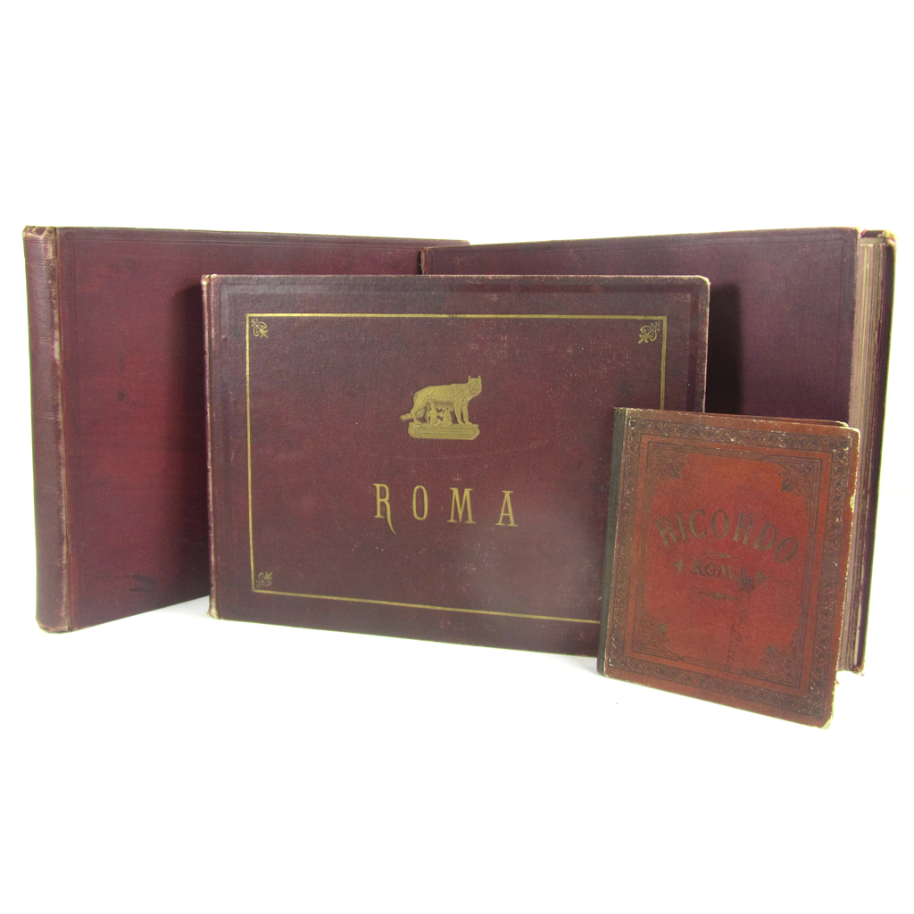 Rive, Robert - Palermo 21 photographs, between 1860 and 1890, each 20 x 25cm, mounted with 'Robert Rive Naples' blindstamps to mounts, also including a panorama, c.177cm, labelled F. Rocchini Photo, all contained in a red cloth album, some fading and dust-soiling; Venice 18 photographs, each 20 x 25cm, mounted, blindstamp of Carlo Ponti to final mount, all contained in a red cloth album, some fading and a little soiling; Rome 60 photographs, between 20 x 25cm and 14 x 25cm, mounted onto both sides of the leaves with printed captions, many showing art, all contained in a red cloth gilt album, stamped 'ROMA'; and another small album of Rome showing photo-reproductions of engravings (4)