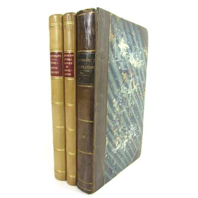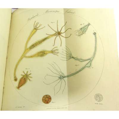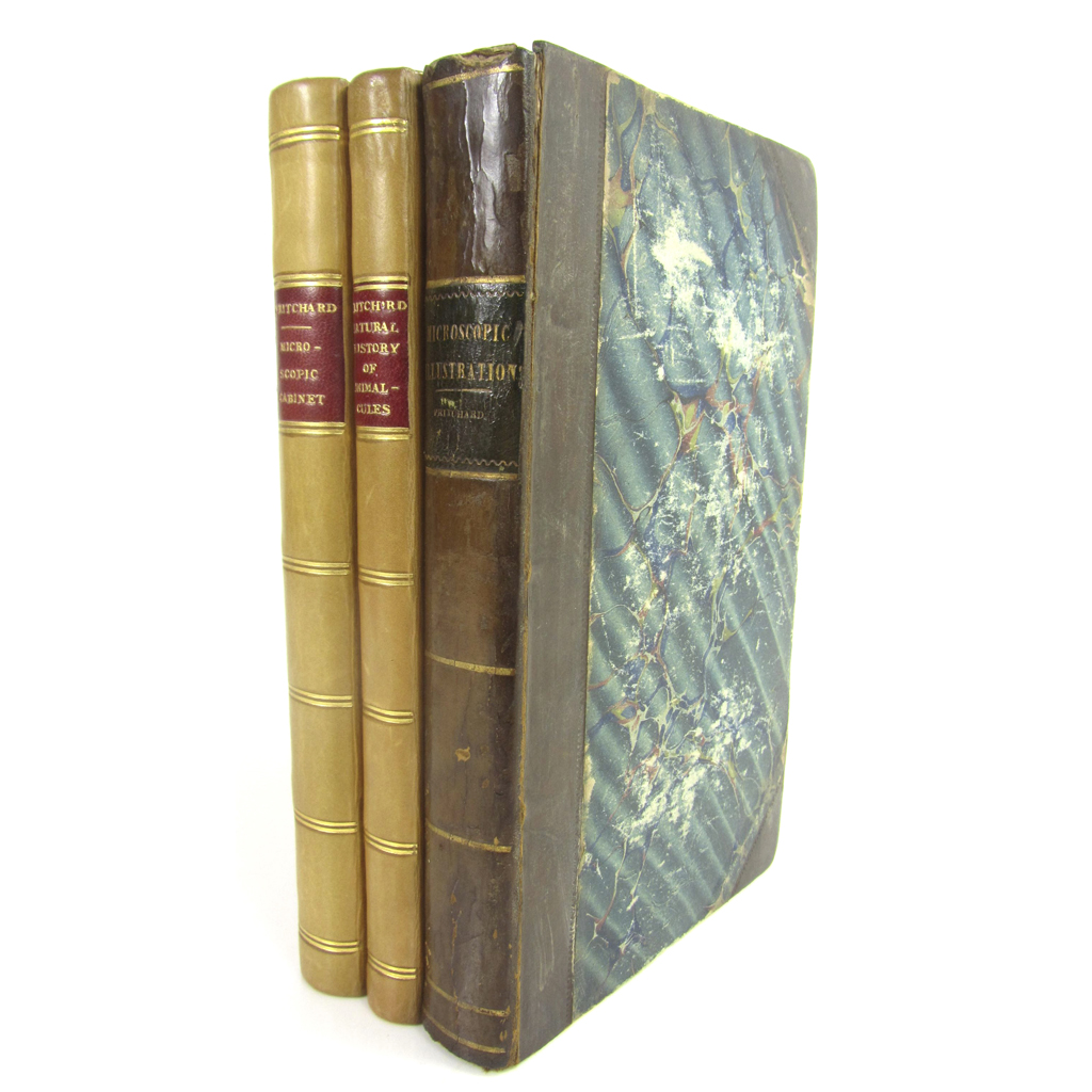The Microscopic Cabinet of Select Animated Objects... London, 1832. 8vo, 13 plates (including 10 hand-coloured), later calf with red morocco gilt label to spine, endpapers renewed, a little light browning and offsetting; [Idem] The Natural History of Animalcules... London: Whittaker & Co., 1834. 8vo, 7 plates, uniform binding, plates somewhat spotted, a little splitting to hinges towards the rear of the book; [Idem] Microscopic Illustrations of Living Objects. London: Whittaker and Co., 1840. New edition, 8vo, with 2 notice slips and an advertising leaf , lacking an initial leaf; bound with an 1841 edition of Animalcules, 16 plates in total in the book, incomplete, contemporary half calf, spotting; Quekett A Practical Treatise on the Use of the Microscope. 1848, plates, later cloth; Quekett's Practical Treatise on the Use of the Microscope [vol. 6 of Library of Illustrated Scientific Works]. 1852, engraved plates, green half morocco gilt; Smith, W. A Synopsis of the British Diatomaceae. 1852, 2 volumes, plates, original cloth, some spotting; Wythes, J.H. The Microscopiest. Philadelphia, 1852, frontispiece, original cloth; Sanders, J.M. The Crystal Sphere. 1857, frontispiece, original cloth; Hogg, J. The Microscope. 1856, Second edition, plates, original cloth, slightly rubbed; Martin, J.H. Microscopic Objects. 1870, original cloth; Martin, J.H. A Manual of Microscopic Mounting. 1872, original cloth; Wilson, W.S. The Larvae of British Lepidoptera and their Food Plants. 1880. 40 coloured plates, contemporary green half morocco; Cole, A.C., editor Studies in Microscopical Science. 1883. vol. 1 -4. in original parts, 1882-87, in modern folding cloth boxes; Hudson, C.T. The Rotifera. 1889. 2 volumes, 4to., coloured plates, maroon half morocco; Pringle, A. Practical Photo-Micrography. 1902; Brady & Martin Catalogue of Scientific Apparatus. 1892, original cloth; Baker, C. Microscopes and Accessories 1935-36, 4to., original wrappers; and others, similar; sold not subject to return