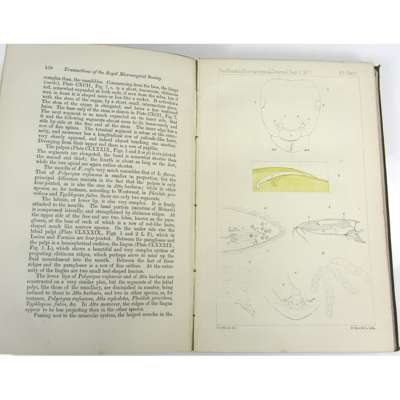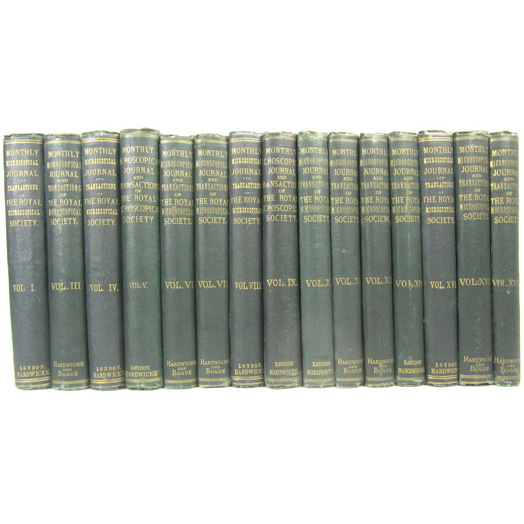 The Monthly Microscopical Journal. Transactions of the Royal Microscopical Society. 1869-1958. A long run, comprising volumes 1, 3, 4-18 in original green cloth, and, in original parts (complete unless stated otherwise), for 1878-1896, 1913-1918, 1922-1934, 1936, 1937 (3 parts of 4), 1939-40, 1944, 1950 (parts 3-4 only), 1952, 1958 (parts 3-4 only), 1969 (part 3 only); spines of parts slightly rubbed; and several duplicates; sold as a journal not subject to return