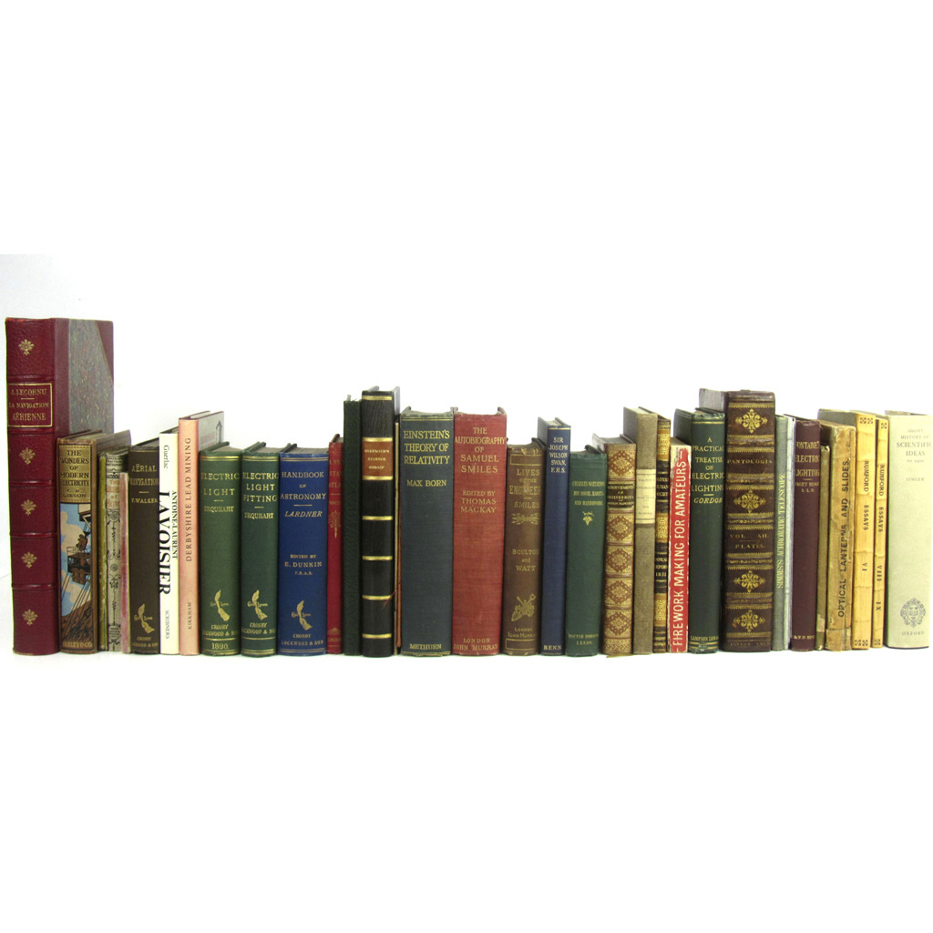 Lecornu, J. La Navigation Aerienne. Paris: Librairie Nony & Co, 1903., 4to, half red Morocco; Dalton, John Meteorological Observations and Essays. London: Baldwin and Cradock, 1834. Second edition, 8vo., original cloth; The Royal Humane Society the Seventy-Seventh Annual Report... The most approved and effectual methods for recovering persons apparently drowned or dead. London, 1851. 8vo., contemporary calf with panelled with gilt floral tooling and ink cross hatch decoration; Browne, W. H. Firework Making for Amateurs. London: L. Upcott Gill, 1888; Vernon-Harcourt, L. F., Achievements in Engineering During the Last Half Century. London: Seeley and Co. Ltd, 1891. 8vo, calf; Gordon, J. E. H. A Practical Treatise on Electrical Lighting. London: Sampson Low, Marston, Searle and Rivington, 1884. 8vo. cloth; Einstein, Albert The origins of the General Theory of Relativity. Glasgow: Jackson, Wylie and Co., 1933. 8vo, original wrappers, case; and a large quantity of others, sold not subject to return