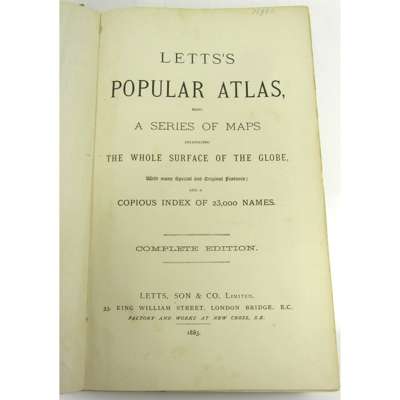 Letts's Popular Atlas... London, 1883. Folio, 156 maps, original red cloth with decoration in gilt and black, some leaves detaching from text block, slight occasional soiling, covers and spine slightly rubbed and bumped