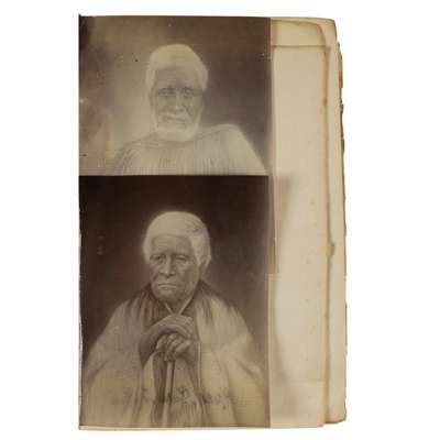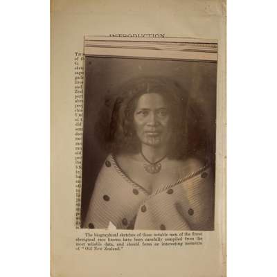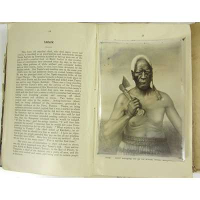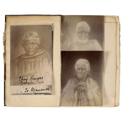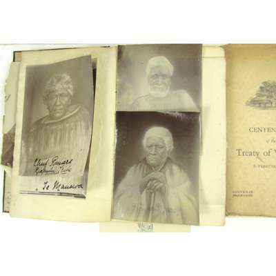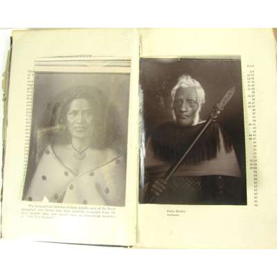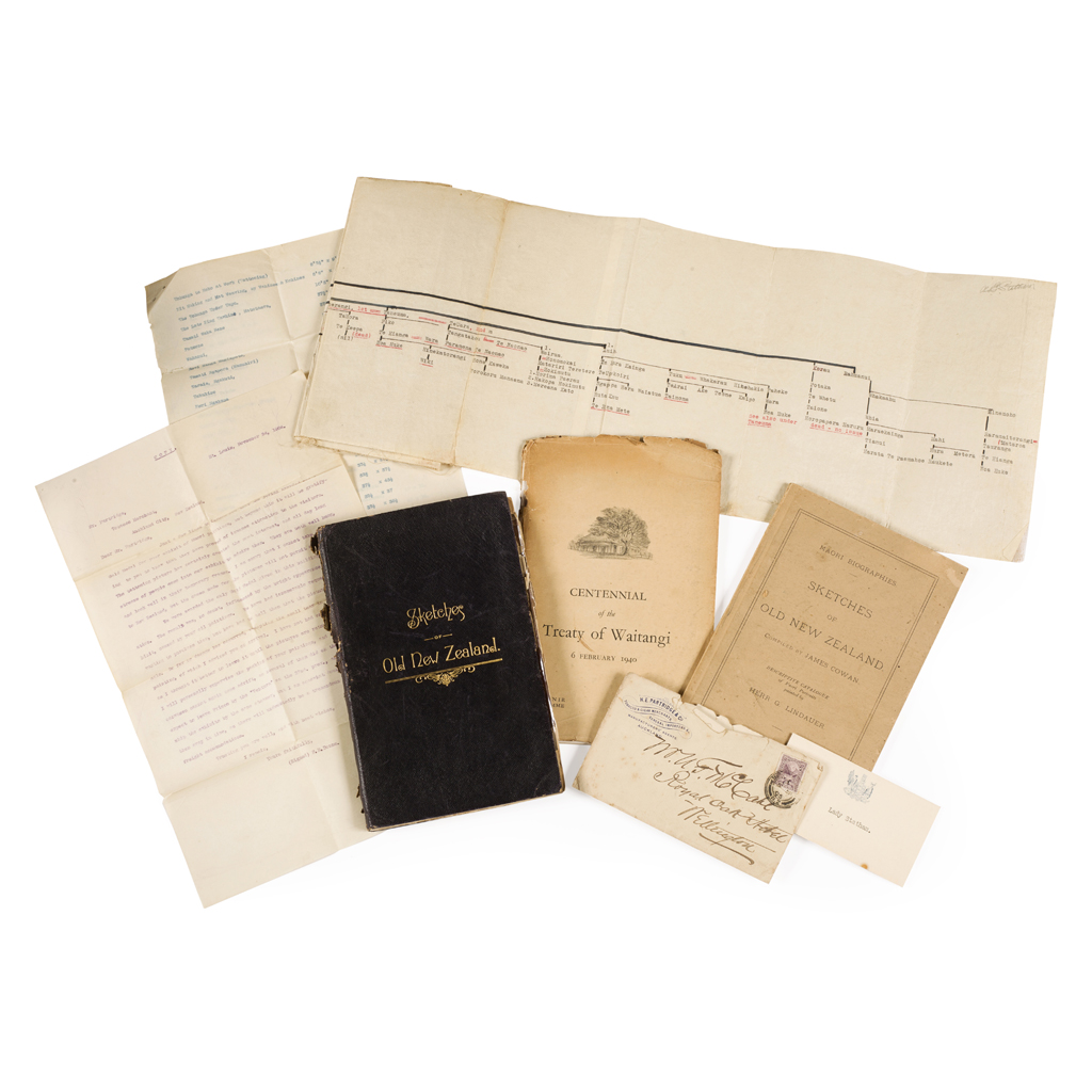 Sketches of Old New Zealand. Maori Biographies. Descriptive Catalogue of Maori Portraits painted by Herr G. Lindauer. Auckland: Printed for H.E. Partridge, 1901. First edition, 8vo, vignette illustrations, original printed boards, a few spots to boards; Cowan, James Another copy of the same work, with 46 contemporary photographs of the original paintings pasted or tipped-in throughout, photographs somewhat faded, occasional small areas of text adhering to image, notes in ink to endpapers and majority of portrait photographs identified to the verso in pencil or ink, publisher's morocco, gilt lettered, spine perished, contents loose, with loosely inserted 1) a typed copy letter from St. Louis, 24/11/1904 to Mr Partridge from F.E. Donne, informing the recipient of the Gold Medal awarded for his Maori paintings at the St. Louis World's Fair, &c.; 2) copy on 3 leaves typed with picture titles and sizes, corresponding with the "Contents" list in Sketches of Old New Zealand 3) a typewritten letter to Mr U.F. McCabe from H.E. Partridge discussing the conditions under which, in the future, he might sell his collection; 4) folding pedigree of Kahungunu, on linen-backed paper, [c.1940]; Centennial of the Treaty of Waitangi, 6 February 1940, Souvenir Programme. 1940, 8vo, wrappers, worn and detached