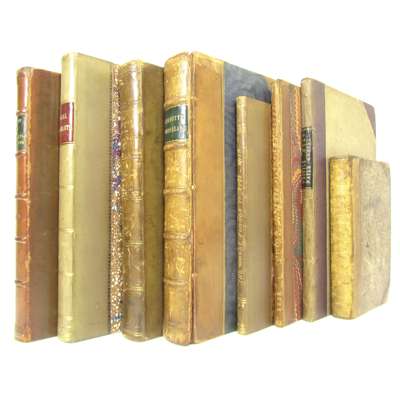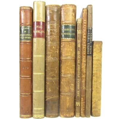 Reid, D.B. Health of Towns Commission. Report on the State of Newcastle-upon-Tyne and other Towns. 1845, 8vo., 21 plates (19 folding, 20 coloured), half calf; [Pamphlets] 7 local pamphlets including Bruce, J.c. The Wall of Hadrian. Newcastle, 1874 and Carr-Ellison, R. On the large Roman Altar, [c.1875], 2 albumen prints; half calf gilt; Hutton, W. The History of the Roman Wall. 1813. Second edition, 8vo, map and 9 plates, contemporary half calf; Garbutt, George A Historical and Descriptive View of the Parishes of Monkwearmouth & Bishopwearmouth and the Port and Borough of Sunderland. Sunderland, 1819. 8vo, engraved title, folding map, folding pedigree & 4 plates, half calf, joints splitting; [Bewick, Thomas] An Account of the Great Floods in the Rivers Tyne, Tees, Wear and Eden, &c. in 1771 and 1815. Newcastle: E. Charnley, 1818. [One of 300 copies], 12mo in 4s, wood-engravings, 19th century half calf gilt; Oliver, Thomas A New Picture of Newcastle upon Tyne. 1831. 12mo, 2 folding plans, 1 folding plate, contemporary half calf, slightly rubbed; Glynn, E. Sketches of Oldminster. Newcastle, 1858. 8vo, 19th century half calf, rubbed; [Newcastle Water Supplies] Prospectus of an intended Joint Stock Company, to be called the Whittle Dean Water Company, and to be formed for the purpose of supplying the Towns of Newcastle Upon Tyne and Gateshead.. with pure water. Newcastle: printed at the Courant Office, 1845. 8vo, folding part-coloured engraved plan, Rare; bound with 2 others, related, contemporary half cloth (8)