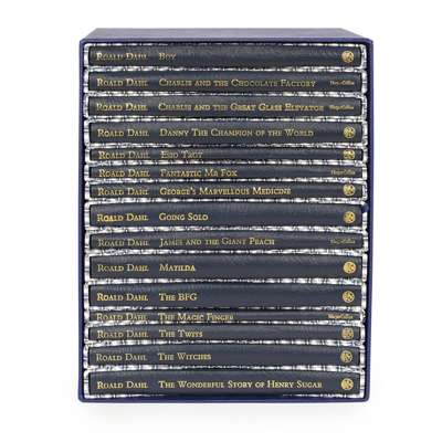 Works [Commemorative Limited Edition]. London: Jonathan Cape and Harper Collins, 1991. 15 volumes, 8vo, number 405 of 500 sets, comprising: Charlie and the Chocolate Factory; Charlie and the Great Glass Elevator; Matilda; The BFG; Fantastic Mr Fox; James and the Giant Peach; Danny the Champion of the World; George's Marvellous Medicine; The Twits; The Witches; The Magic Finger; Esio Trot; The Wonderful Story of Henry Sugar; Boy; Going Solo; uniform blue quarter morocco gilt, each in slipcase, contained in original blue presentation box (15)