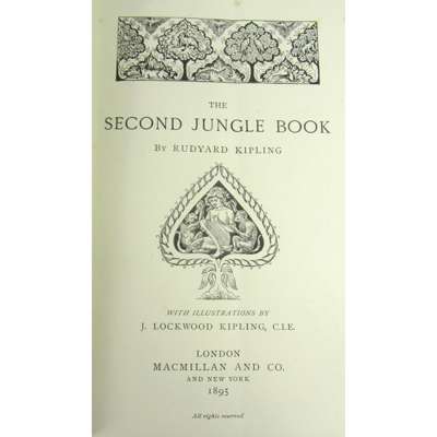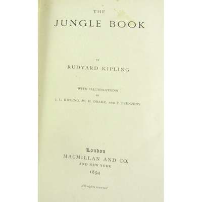 The Jungle Book. London: Macmillan and Co., 1894. First edition, first impression with R. & R. Clark listed as the printer with no Ltd. company status, 8vo, frontispiece, original blue cloth gilt, some foxing, hinges a little split, some rubbing to covers, shelf-lean; [Idem] The Second Jungle Book. London: Macmillan and Co., 1895. First edition, 8vo, original blue cloth gilt, some foxing, lower endpaper detaching, shelf-lean, slight rubbing; spines faded (2)