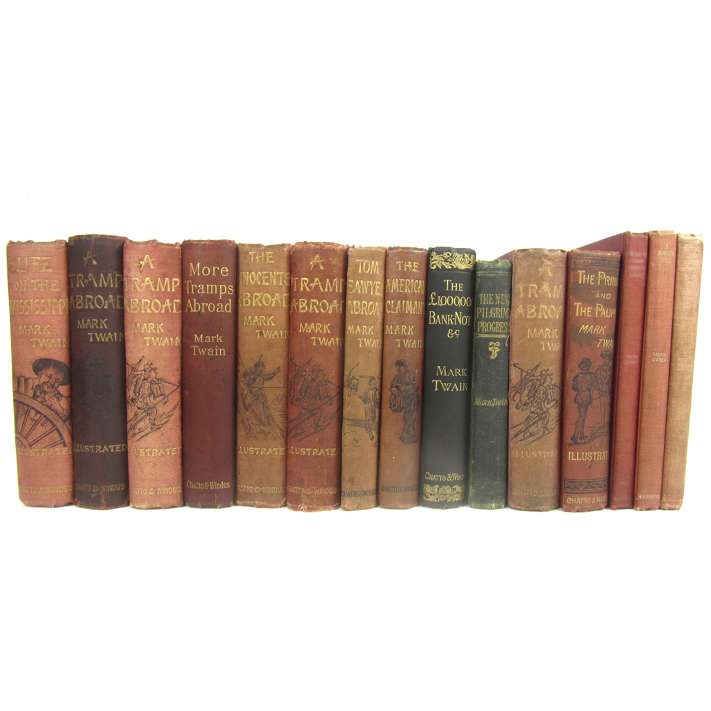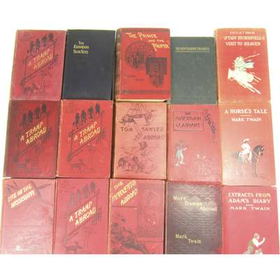 A Tramp Abroad. London, 1880. 8vo, original red cloth; and 2 other copies; A Tramp Abroad. London, 1881. 8vo, original red cloth; The Innocents Abroad. London, 1881. 8vo, original red cloth; The Prince and the Pauper. London, 1882. 8vo, original red cloth; Life on the Mississippi. London, 1883. 8vo, original red cloth; The American Claimant. London, 1892. 8vo, original red cloth; The £1,000,000 Bank-Note. London, 1893. 8vo, original black cloth; Tom Sawyer Abroad. London, 1894. 8vo, original red cloth; More Tramps Abroad. London, 1897; and 4 others, all works with some wear and fading to covers (15)