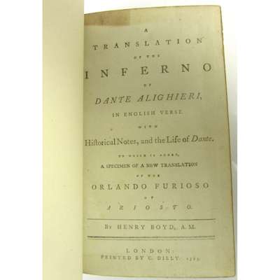 A Translation of the Inferno of Dante Alighieri in English Verse... London: Printed by C. Dilly, 1785. 2 volumes, 8vo, contemporary calf neatly rebacked with modern spines, endpapers renewed, some adhesion between N6 & N7 in volume 1 [ESTC T127831] (2)