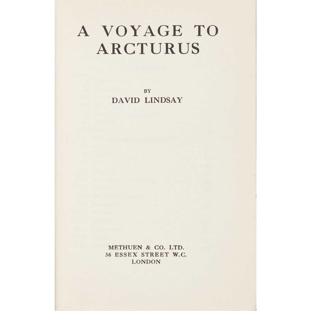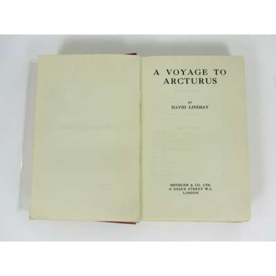 A Voyage to Arcturus. London: Methuen, 1920. First edition, 8vo., 8pp., of publisher's catalogue at the end, publisher's red cloth, lettered in blind on the upper cover and in gilt with gilt rules on the spine, spine slightly faded, with the bookplate of R. J. Dickinson