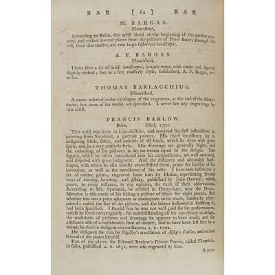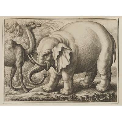 Note: With an extensive range of examples of the works of the various engravers produced at various periods, amongst which are an elephant and camel by Francis Barlow (Vol. 1 p. 62); 2 contemporary prints on gold silk by Jacques Callot from Les Miseres (there are 2 further prints by Callot, the 4th at Vol. 2 p. 283); The family of the Count Palatine by Crispin de Passe (Vol. 3 p. 204); "Minerva" after Golzius by Saenredam (loosely inserted opposite p. 290 on vol. 4); and 2 further prints on silk after Rembrandt by Thomas Worldige (after p. 248 in vol. 4).