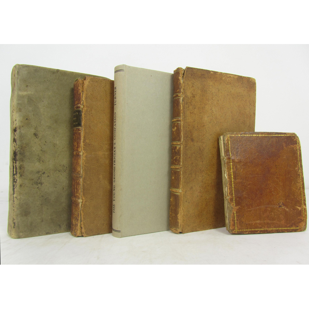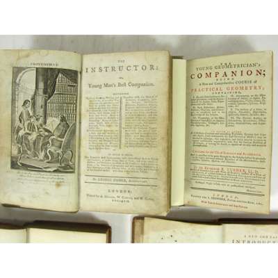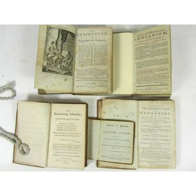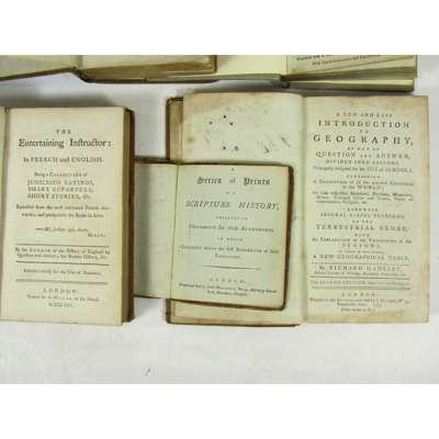 The Entertaining Instructor: in French and English. London: A. Millar, 1765. First edition, 12mo, half title, contemporary speckled sheep, a few spots, worn, [ESTC T128371]; Turner, Richard The Young Geometrician's Companion. London: S. Crowder, 1787. First edition, 12mo, title printed in red and black, modern boards, 1 word on title gone over in black ink, [ESTC T112951, 6 copies]; Gadesby, Richard A New and Easy Introduction to Geography. London: for the author, sold by S. Bladon, 1783. Second edition, 12mo, folding engraved plate, short tear in plate, contemporary sheep, some stains, rubbed, joints splitting, [ESTC T113973: BL only, COPAC adds NLS]; [Trimmer, Mrs Sarah] A Series of Prints of Scripture History. London: John Marshall, [c.1790]. 24mo, 32 engraved plates, contemporary sheep, worn, lacks spine, upper cover virtually detached, [ESTC T132938]; Fisher, George The Instructor, or Young Man's Best Companion. London: A. Millar, W. Cadell [&c.], 1794. 12mo, engraved frontispiece, 1 folding plate, illustrations, contemporary reversed calf, somewhat spotted and soiled, [ESTC N16991] (5)