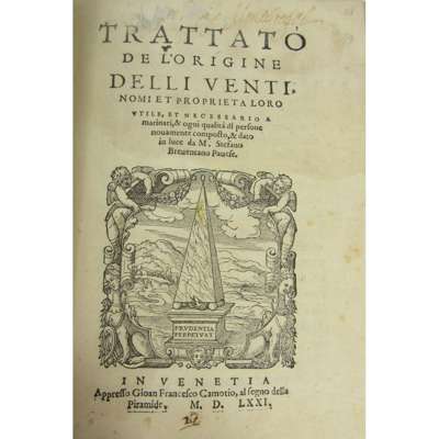 Trattato de l'origine Delli Venti. Venice: Giovanni Francesco Camocio, 1571. Small 4to, later paper-covered boards [USTC 816863]