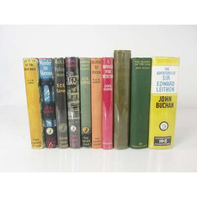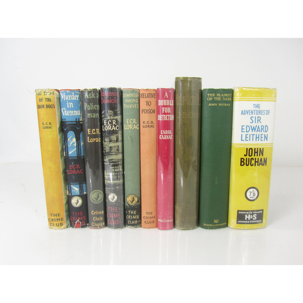 The Theft of the Iron Dogs. London: The Crime Club, 1946. 8vo, dust-jacket with a few tears and repairs; [Idem] Relative to Poison. London: The Crime Club, 1947. 8vo, original cloth, ownership stamp to free-endpaper; [Idem] Ask a Policeman. London: The Crime Club, 1955. 8vo, dust-jacket, ownership inscription to front free-endpaper; [Idem] Murder in Vienna. London: The Crime Club, 1956. 8vo, dust-jacket a little chipped and price-clipped, some foxing; [Idem] Dangerous Domicile. London: The Crime Club, 1957. 8vo, dust-jacket, ownership signature to free-endpaper; [Idem] Dishonour among Thieves. London: The Crime Club, 1959. 8vo, dust-jacket with a few small chips, ownership signature to free-endpaper; Carnac, Carol A Double for Detection. London: MacDonald & Co., [n.d.] 8vo, dust-jacket; Buchan, John The Half-Hearted. London: Ibister & Co. Ltd., 1900. 8vo, original pictorial cloth; [Idem] The Blanket of the Dark. London: Hodder and Stoughton, 1931. 8vo, original cloth; [Idem] The Adventures of Sir Edward Leithen. London: Hodder and Stoughton, 1938. 8vo, dust-jacket (10)
