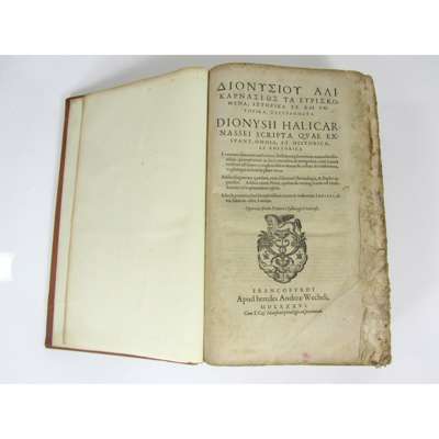 Chronologia dionysiu alikarnaseos ta heuriskomena, historika te kai retorika, syngrammata. Dionysii halicarnassei scripta quae exstant, omnia, et historica, et rhetorica … Opera et studio Friderici Sylburgii veterensis. Frankfurt am Main: apud heredes AndreaeWecheli, 1586. 2 volumes in one, folio, printer's device on the title-pages to both volumes and on the final leaf of volume 2, folio, early calf, gilt centre pieces of laurel wreath, modern rebacking, margins of first and last few signatures rubbed and worn, some slight marginal worming (mostly single hole)