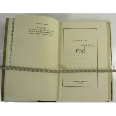 Foe. London: Secker & Warburg, 1986. First edition, signed on title page, original cloth, dustwrapper; Life and Times of Michael K. 1983; Age of Iron. 1990; The Master of Petersburg. 1994; Boyhood. 1997, 2 copies; Disgrace. 1999; The Lives of Animals. 2001, paperback; Youth. 2002; Elizabeth Costello. 2003, 2 copies; Slow Down. 2005; Slow Man. 2005, signed; Diary of a Bad Year. 2007; Summertime. 2009; Disgrace. 2010, limited to 2500 copies; Scenes from Provincial Life. 2011; The Childhood of Jesus. 2013, 2 copies, First American edition signed & with slipcase; Hero and Now. 2013, original boards; The good story. 2015; The Schooldays of Jesus. 2016; McEwan, Ian Atonement. London: J. Cape, 2001. First edition, 8vo, signed on title page, original cloth; Ondaatje, Michael The English Patient. London: Bloomsbury, 1992. First edition, signed on title page, dustwrapper slightly rubbed at extremities; Sebald, W.G. Austerlitz. 2001, uncorrected proof copy, original boards; Austerlitz. 2001, 2 copies; The Rings of the Saturn. 1998, paperback; Vertigo. 1999, paperback; On the Natural History of Destruction. 2003; Unrecounted. 2005, paperback; A Place in the Country. 2013; all with dustwrappers unless noted (32)
