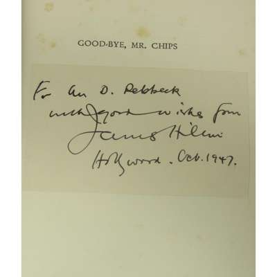 Goodbye Mr. Chips. [London:] Hodder and Stoughton, 1934. First edition, 8vo, original blue cloth gilt, dust-jacket (soiled with tears and repairs), inscription from the author laid-down to half-title: For ? D. Rebbeck with good wishes from James Hilton Hollywood. Oct. 1947", ownership signature to endpaper and initials to dust-jacket, a little foxing, mainly to fore-edges