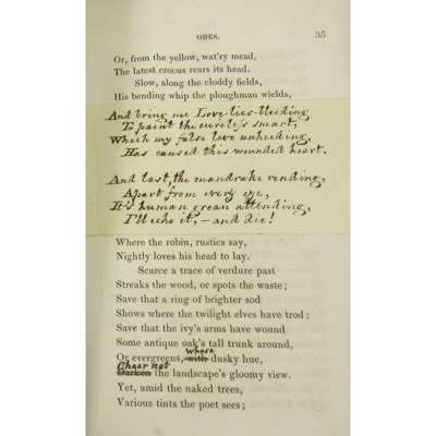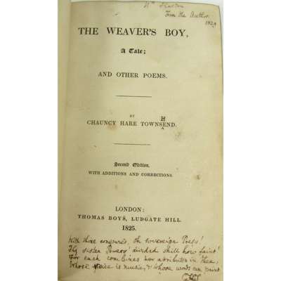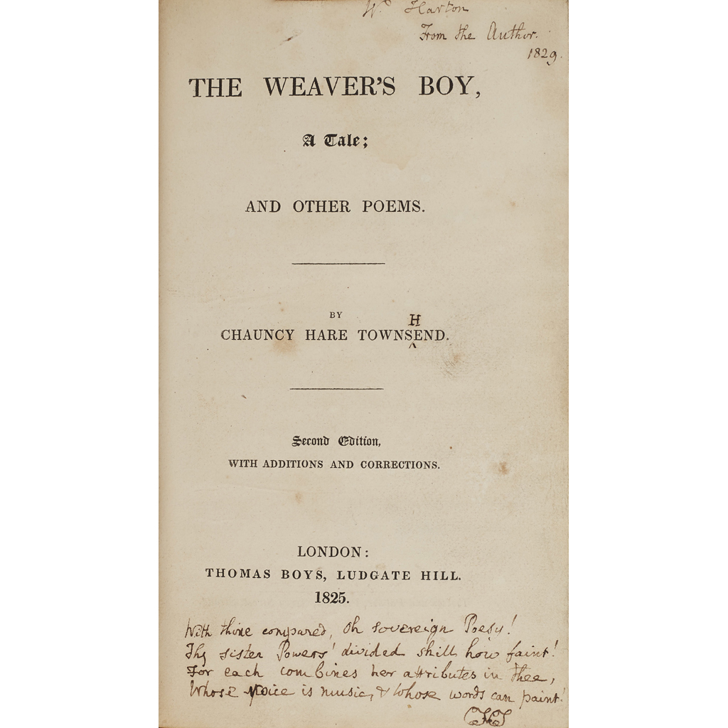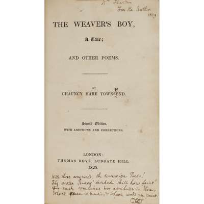 The Weaver's Boy. London: Thomas Boys, 1825. Second edition, 12mo, inscribed to the title-page: "W. Harton, From the Author, 1829 / With those compared, oh sovereign Poesy! / Thy sister Powers' divided still how faint! / For each combines her attributes in thee,/ Whose voice is music, & whose words can paint.", with manuscript corrections and inserted slips to several poems, contemporary black embossed calf gilt, some slight soiling throughout, a little rubbing to covers