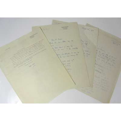 A collection of 11 autograph and 1 typed signed letters to Mr [Branko] Brusar, one about the "Sop poems", "making a few revisions in Space Visits and meeting Mr Sabjlak", one saying "2000-3000 lines seems a very big job", saying "I would like to collaborate in your project", referring to Struga poetry festival "the mistake they make is in inviting too many poets", one promising "to help you with the new Sop translations", one listing the changes he has made, saying he is sending the poem to Encounter, saying of Nikola Šop that he was "surprised and shocked that very few of the poets [at the Struga Poetry Festival] seemed to know anything about him", one noting "to revive translations of children's poems is fiendishly difficult..", one with corner torn away with loss of a telephone number