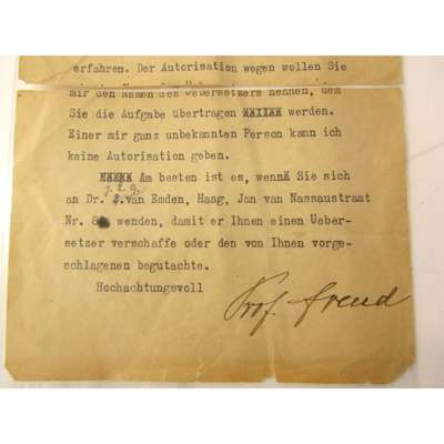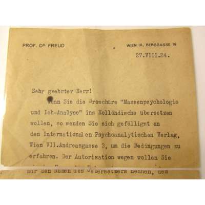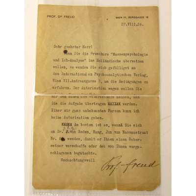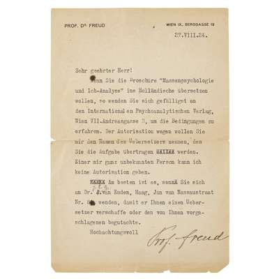 Typed letter signed ("Prof. Freud"), in German, to the Germanist Pieter Smink ("Sehr geehrter Herr"), about his work "massenpsychologie und ich-analyse", discussing a proposed Dutch translation, asking him to write to his publisher for the conditions, requesting that he inform him of the name of the intended translator, as he cannot authorise a translation by somebody he does not know, and suggesting, finally, that he approach Dr J. van Emden in the Hague, who can either supply a translator or report on the one chosen by him: ...Der Autorisation wegen wollen Sie mir den Namen des Uebersetzers nennen, dem Sie die Aufgabe übertragen XXXXXX werden. Einer mir ganz unbekannten Person kann ich keine Autorisation geben..., 1 page, 8vo (223 x 150mm.), later manuscript annotation in pencil, Vienna, 27 August 1924, split along horizontal fold, creasing, a few tiny tears to lower edge, browning, two small stains