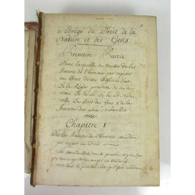 Abrégé du Droit de la Nature et des Gens, containing 882 manuscript pages, contemporary speckled calf with the bookplate of The Honorable George Baillie Esq, one of the Lords of the Treasury, bookplate dated 1724, upper cover detached, lower joint split