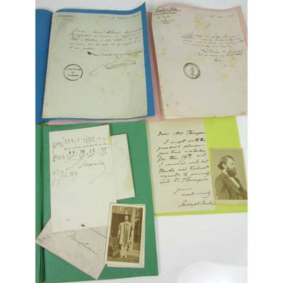 A collection of c.70 letters, signatures and manuscript notes from 19th century musicians and composers, including: John Ryder, Joseph Joachim, William Sterndale Bennett, Clara Novello, Giulia Grisi, including a carte-de-visite photo and two lines of autographed music, Henry Holmes, Alfred Novello, Sir Frederick Arthur Gore Ouseley ("By all means finish my anthem "O Love the Lord" if you wish..."), John Parry, Frederic Archer and Sir Henry Irving; Musical manuscript Early to mid 20th century musical score predominantly comprising a copy of a piece of music George Enescu (Georges Enesco) in four movements, folio, 106 manuscript pages, plus a few pages with national anthem tunes, on G. Schrimer New York paper, green cloth (quantity)
